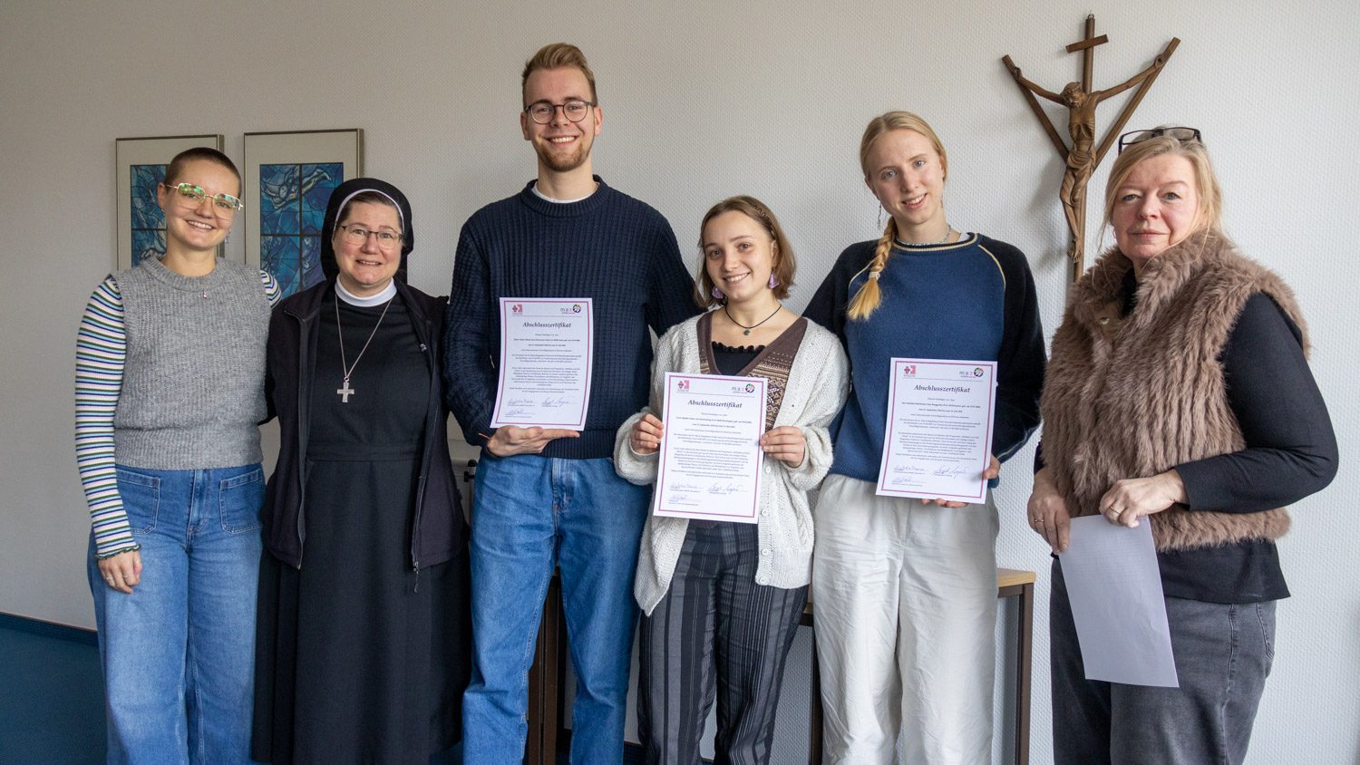 Zum Abschluss erhielten Ida Steinbrück, Carla Cedra und Henry Opitz schließlich aus den Händen von Generalökonomin Schwester Julia Maria Handke, Birgit Bagaric und Ulrich Bock, dem Leiter der Missionszentrale im Bergkloster Bestwig, ihr offizielles Zertifikat. Und dazu gab es eine mit Süßigkeiten gefüllte SMMP-Tasse. Auch die wird dazu beitragen, dieses Jahr nie zu vergessen.
