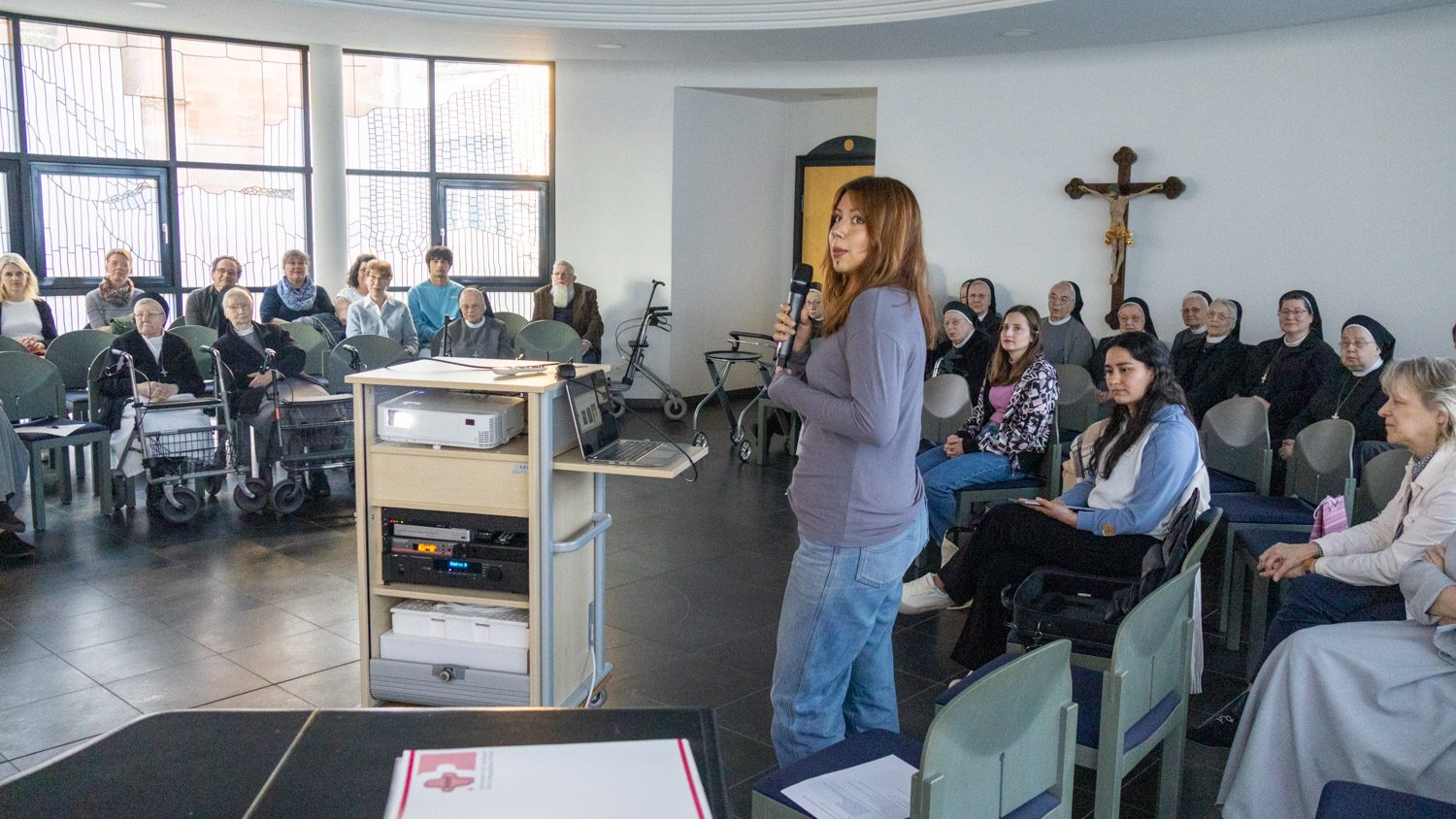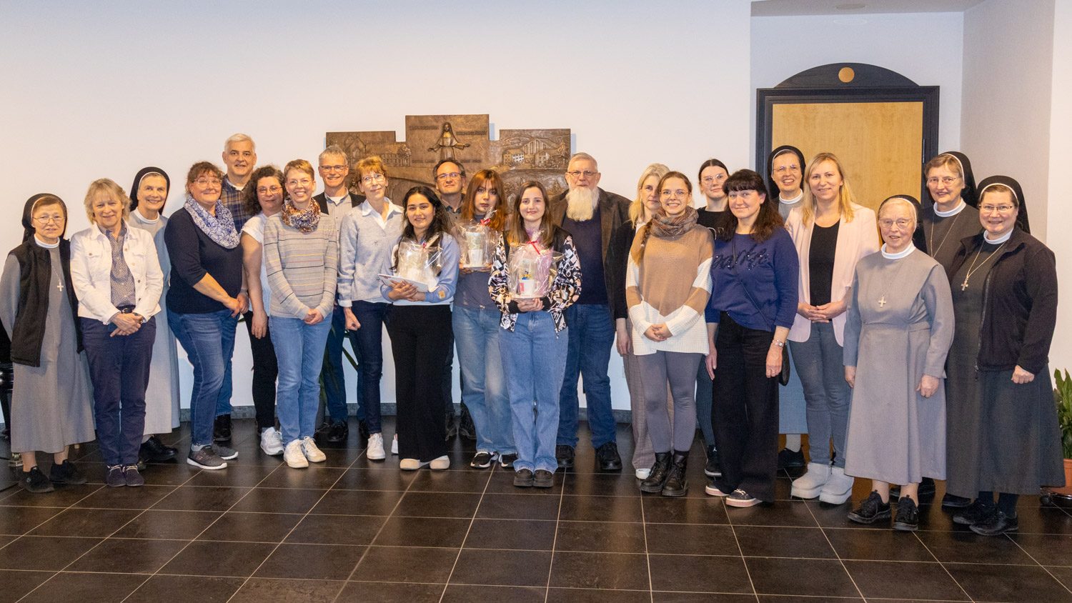 Dabei war der Raum gut gefüllt. Nicht nur zahlreiche Schwestern aus dem Bergkloster waren anwesend – auch die Schwestern aus dem Haus am Weg und die Patres aus der Villa Lampe, wo die Freiwilligen gewohnt haben, Deutschlehrerin Marie-Luise Nübold sowie die Leitungen, Anleiter/innen und wichtige Bezugspersonen aus den Einrichtungen, in denen sie arbeiten durften: María Grace war in den Eichsfelder Werkstätten der Raphael Gesellschaft eingesetzt, Scarleth im Raphaelsheim und Leticia im katholischen Kindergarten St. Gerhard.